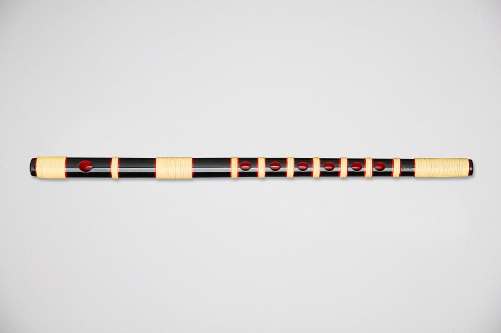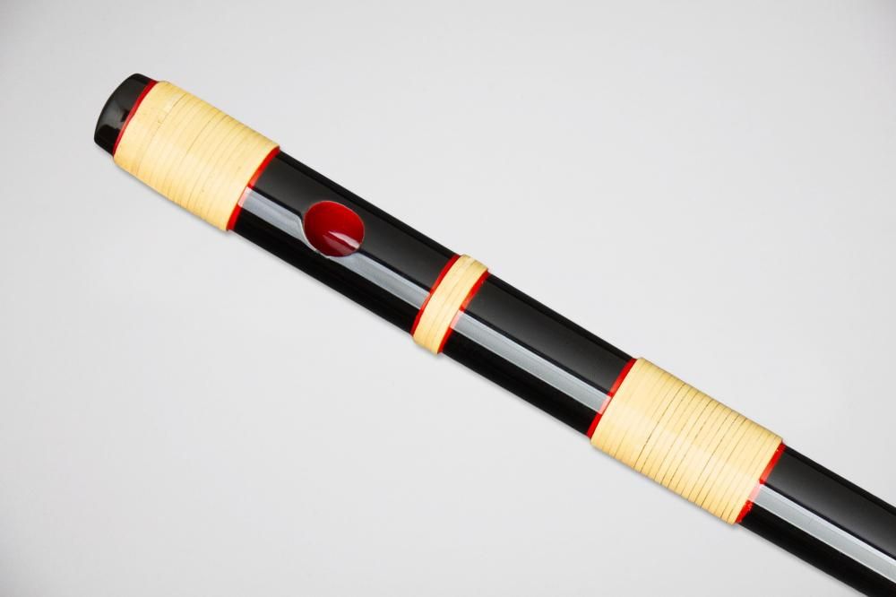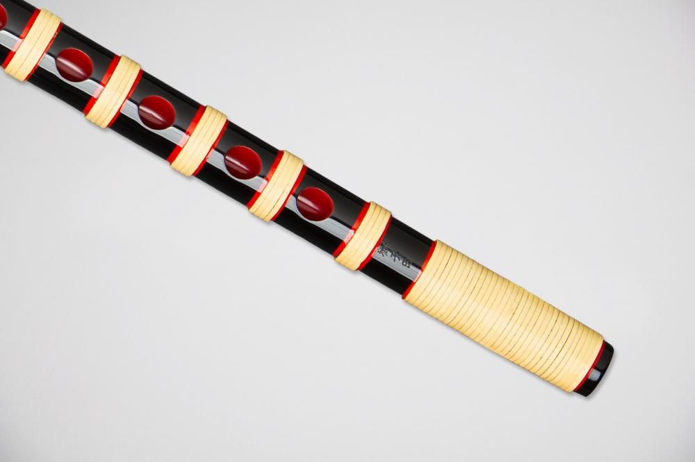 黒に塗りを施し、笛全体に籐を巻いた、色あざやかな篠笛です。