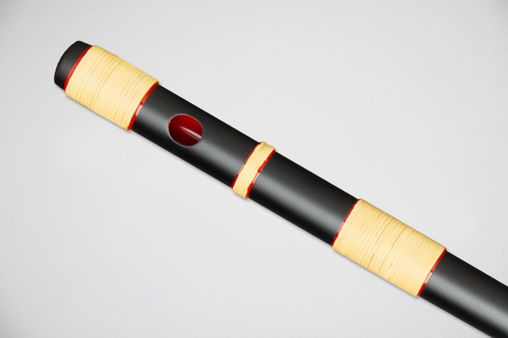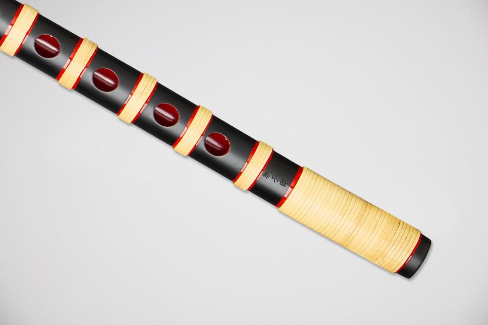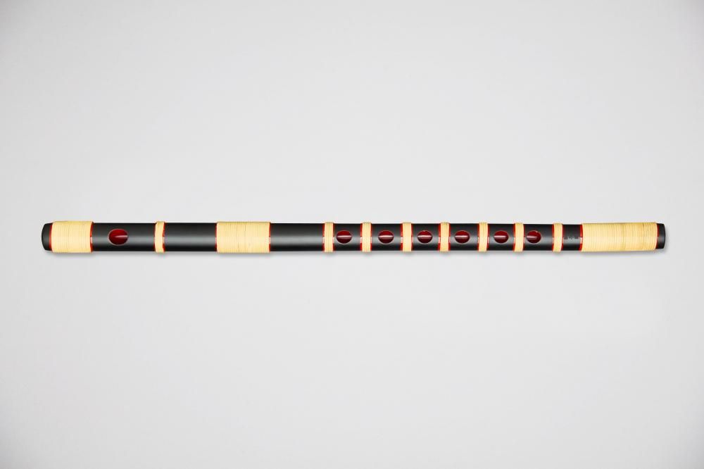 艶消しの黒に塗りを施し、笛全体に籐を巻いた、色あざやかな篠笛です。